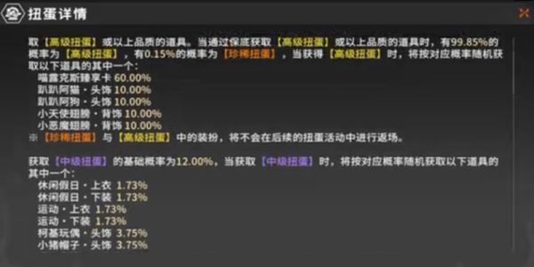 1、扭蛋分珍稀和高級(jí)兩種類型,高級(jí)扭蛋獲取概率百分之九十九點(diǎn)八五,可獲喵露克斯臻享卡趴趴阿貓頭飾等道具,珍稀扭蛋獲取概率百分之零點(diǎn)一五,得限定裝備且后續(xù)不返場(chǎng)。