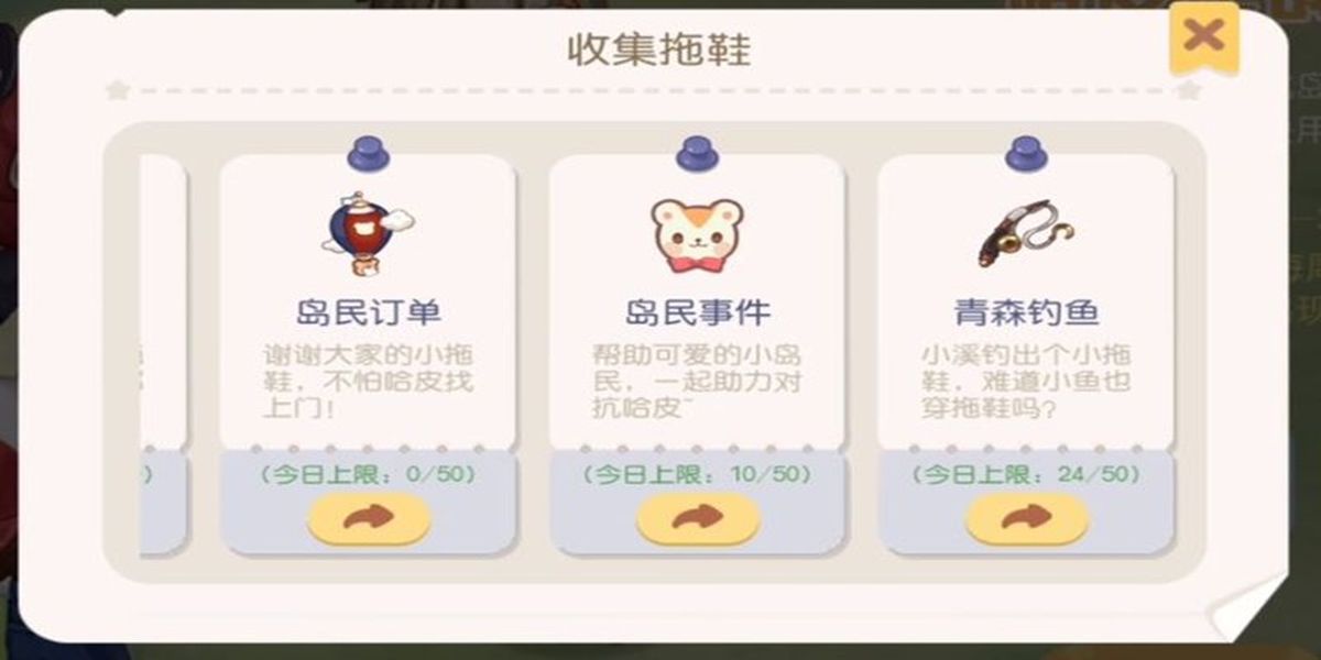 3、通過島民訂單和島民事件也能收集,島民訂單和島民事件都設有每日獲取上限,玩家需在限定數(shù)量內(nèi)合理安排時間完成,積累足夠的拖鞋,為周六周日的驅趕哈皮活動做好準備。