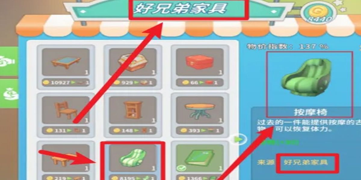 1、按摩椅可在好兄弟家具店直接購買,售價8195金幣,雖價格較高,但實用價值高,能有效恢復體力,提升整體體驗,適合玩家投資。