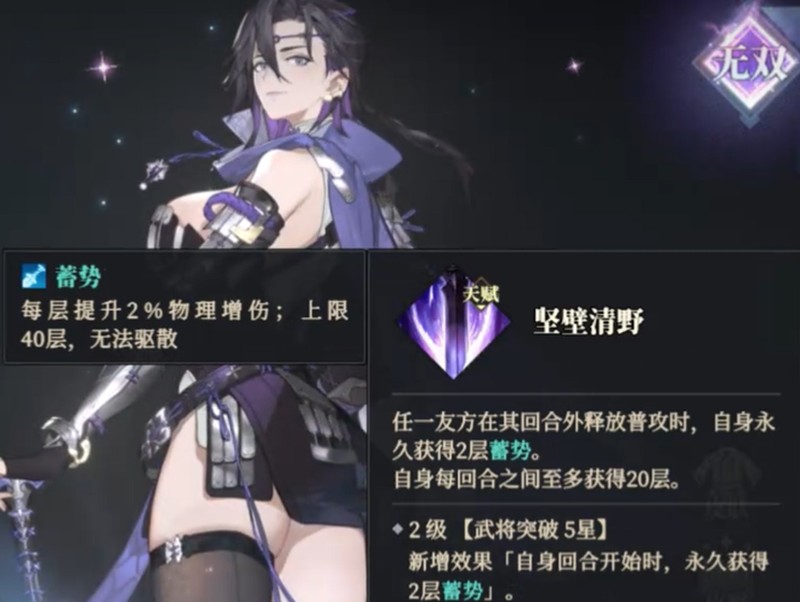2、除了回合結(jié)束,當(dāng)隊(duì)友在回合外進(jìn)行普攻時(shí),同樣能夠?yàn)槠浞e累蓄勢(shì),而天賦堅(jiān)壁清野的存在,讓其在每個(gè)回合開(kāi)始時(shí)都能永久獲得2層蓄勢(shì)。