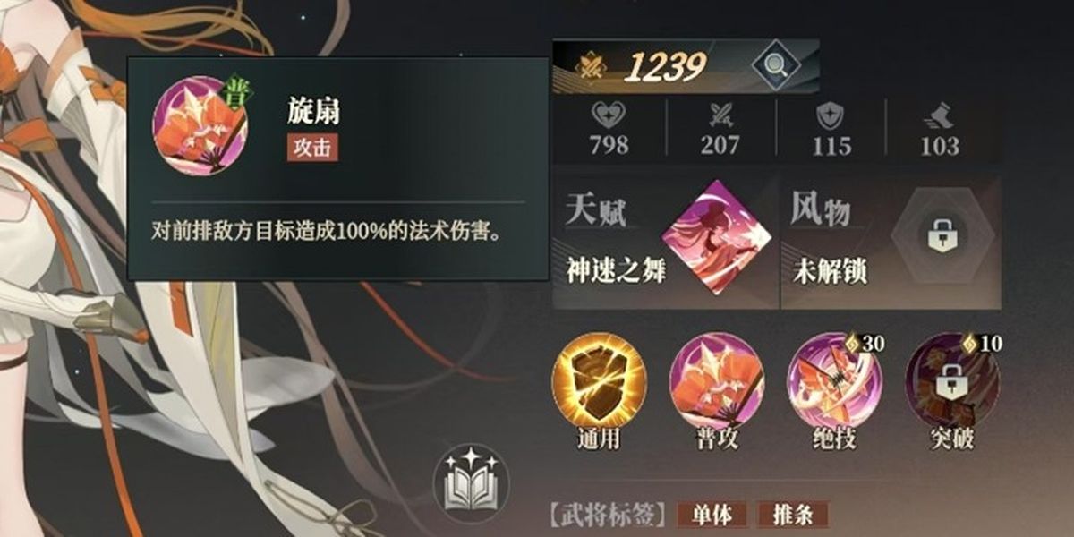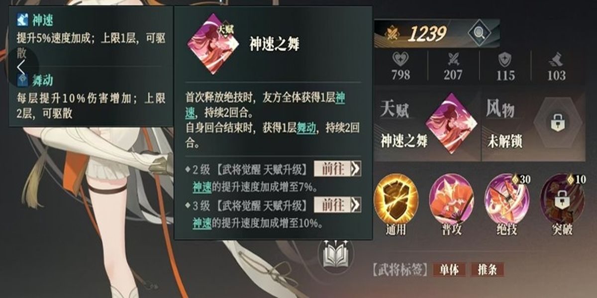 4、神速之舞是喬菱的天賦技能,首次釋放絕技為全體友軍提供持續(xù)2回合神速效果,初始提升5%速度,隨天賦升級加成最高至10%,速度優(yōu)勢助其更快出手,在戰(zhàn)局中搶占先機。