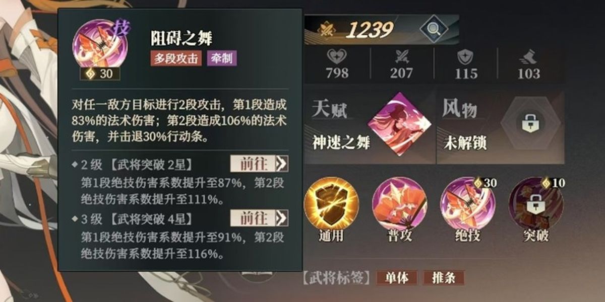 2、隨突破等級提升喬菱實力顯著增強,2星突破時阻礙之舞第一段傷害提升至87%,第二段至111%,4星突破后第一段達91%,第二段高達116%,傷害數(shù)值在藍卡武將中相當(dāng)出色。
