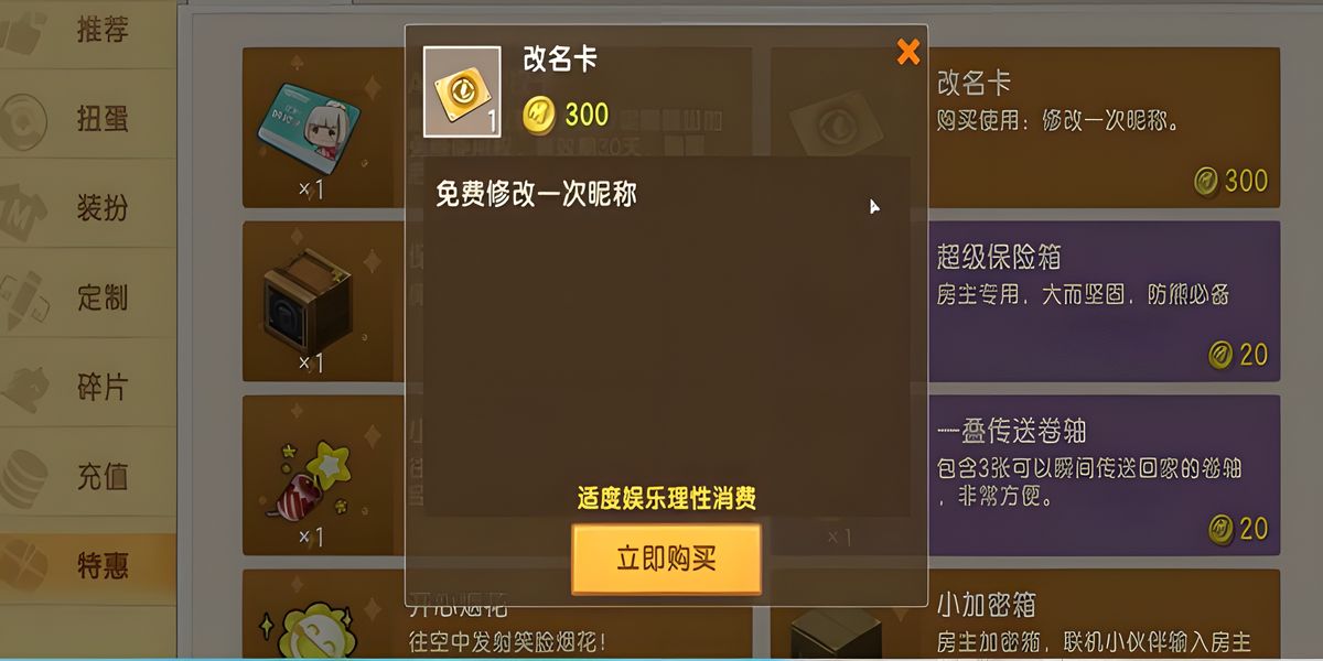 2、若已用完免費(fèi)改名次數(shù),可使用迷你幣購買改名卡,在商城特惠欄目中花費(fèi)300迷你幣能買到,購買后同樣設(shè)置界面使用該道具進(jìn)行昵稱修改,操作較為便捷,滿足多次改名需求。