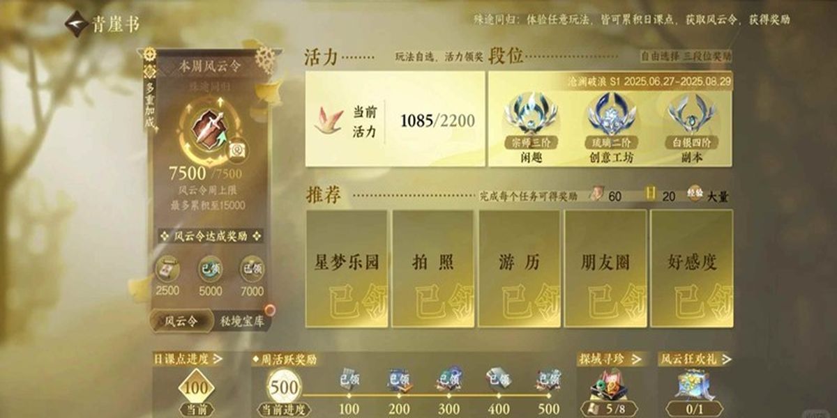 3、每周有多項數(shù)值限制任務(wù),如楊威點1w每周,金戈點2w每2周,領(lǐng)地戰(zhàn)刷滿8000可分紅,逍遙點2000每周,奇巧幣3000每周等,風(fēng)云令7500每周可換獎勵。