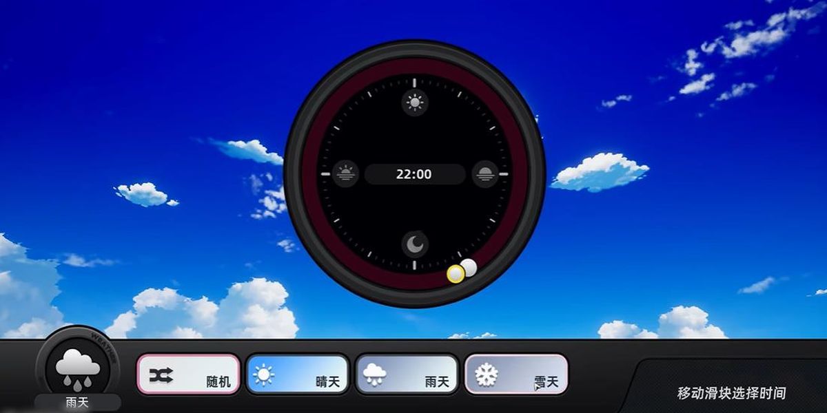 3、點擊后進入天氣與時間調(diào)整界面,在該界面中可以自由選擇時間段與天氣種類,可選天氣包括晴天、陰天、雨天、暴風、雪等,具體會依地圖與劇情有所不同。