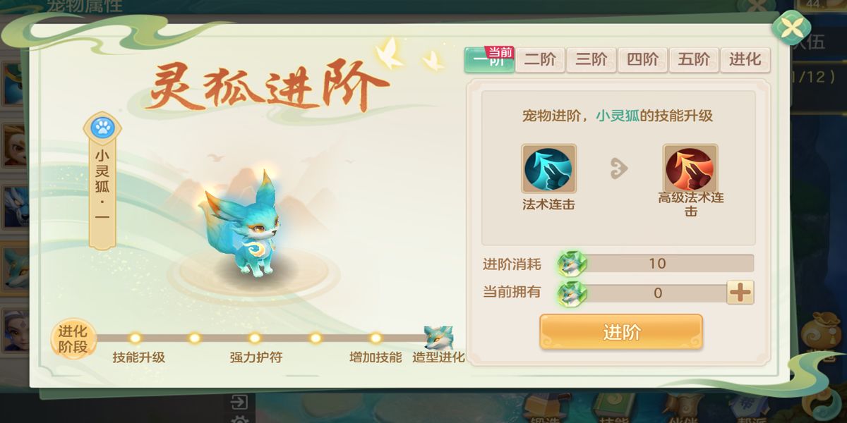 2、進(jìn)階需完成修行之路一至六章獲取進(jìn)階石,經(jīng)六次進(jìn)階為幻靈狐,過程中可獲翅膀碎片、修煉丹等資源,每次進(jìn)階都有技能升級(jí)、資質(zhì)提升或新技能解鎖等效果。