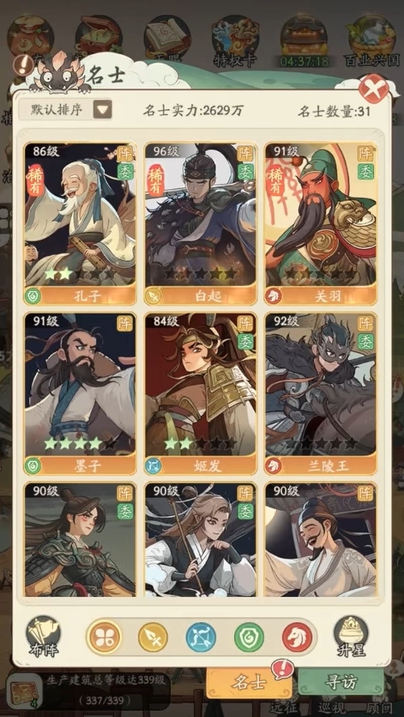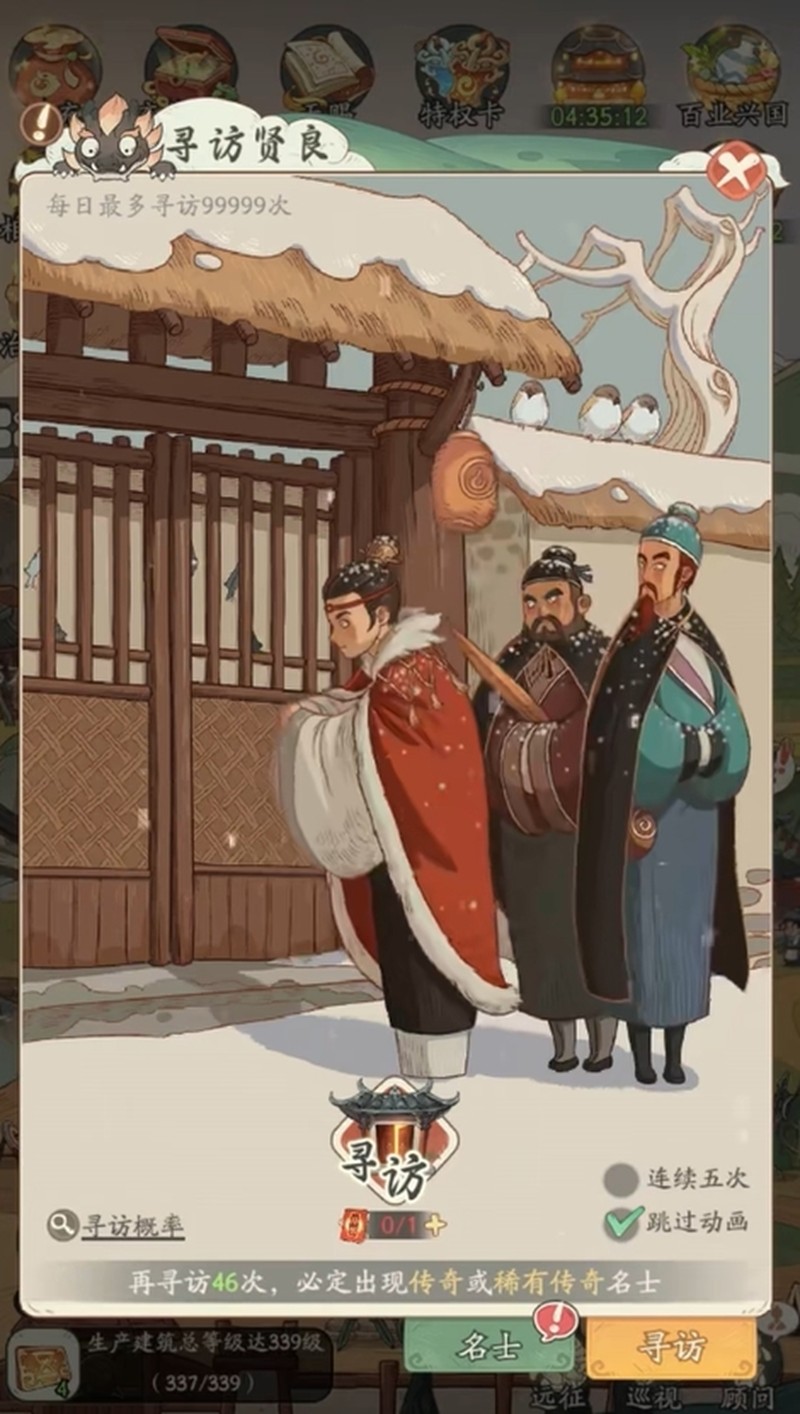 3、獲取名士主要通過活動(dòng)獎(jiǎng)勵(lì)、開箱子和尋訪賢良,尋訪賢良最穩(wěn)定有單抽五連抽和保底機(jī)制,建議優(yōu)先用其獲取高品質(zhì)名士以最大化資源利用效率。