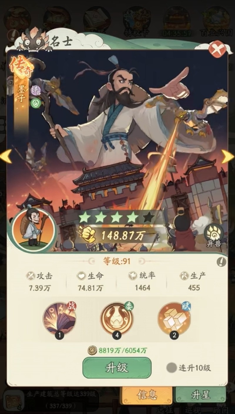 2、升級(jí)是基礎(chǔ)培養(yǎng)方式能提升各項(xiàng)屬性,重復(fù)名士轉(zhuǎn)化為碎片可用于升星,升星能提升基礎(chǔ)屬性和強(qiáng)化技能效果,是快速提升戰(zhàn)力的重要途徑。