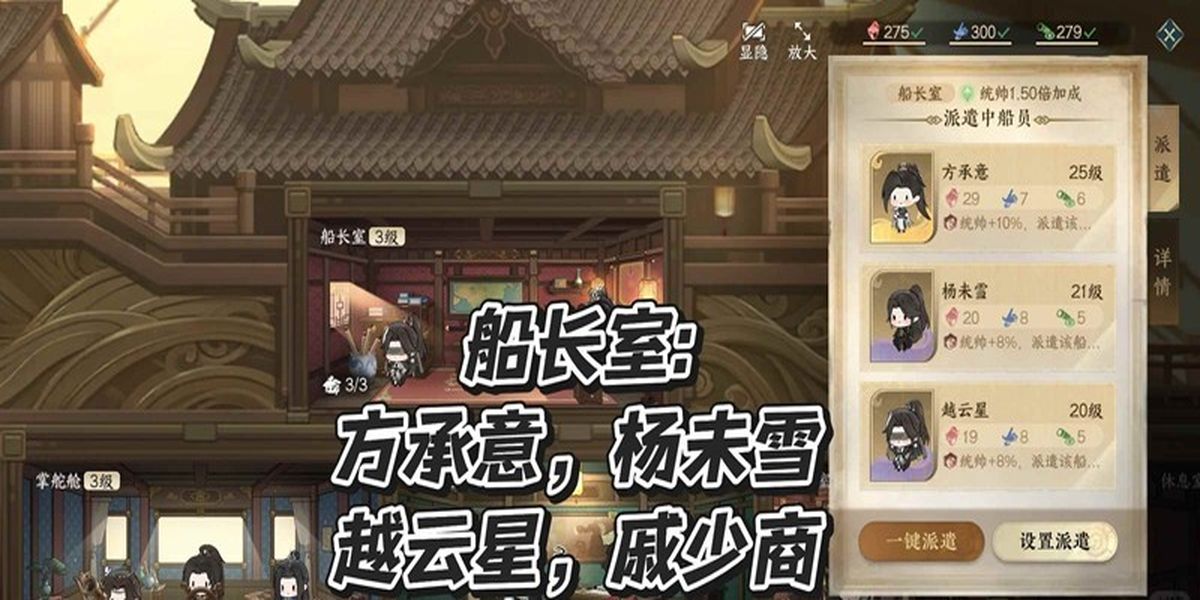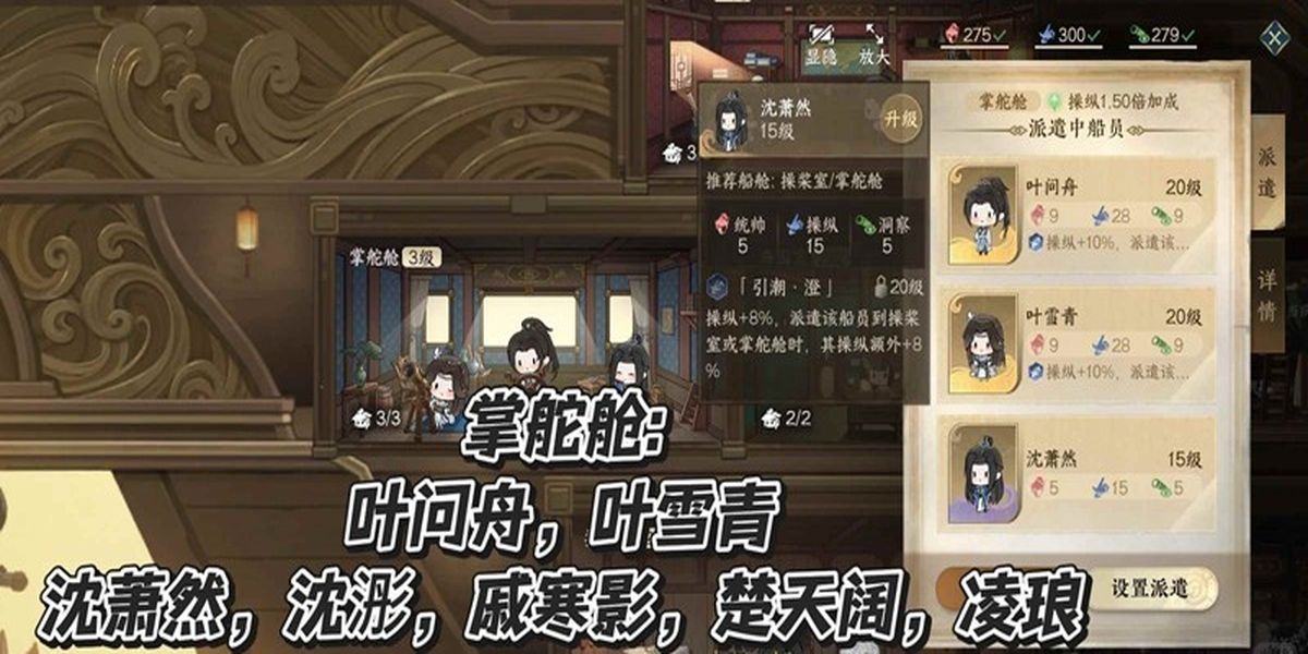 1、船長室適合金級(jí)方承意,紫級(jí)楊未雪、戚少商、越云星,掌舵艙適合金級(jí)葉問舟、葉雪青,紫級(jí)沈蕭然、沈浵、戚寒影、楚天闊、凌瑯,各船艙有適配船員類型。