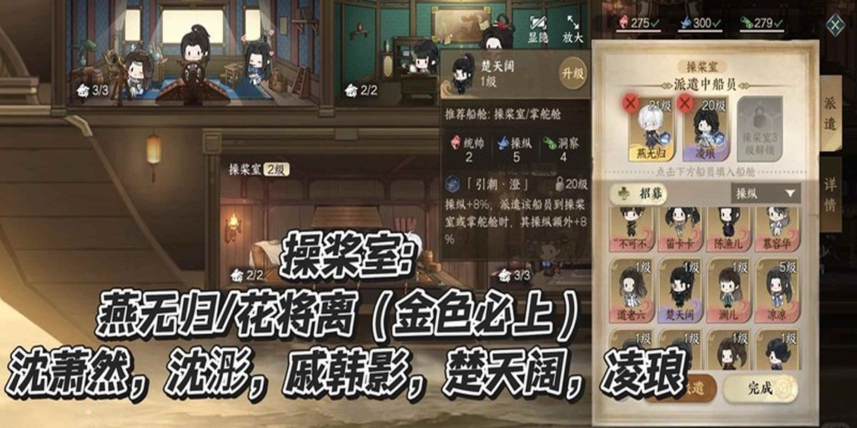 3、操槳室適合金級(jí)燕無歸、花將離,紫級(jí)沈蕭然、沈浵、戚寒影、楚天闊、凌瑯,紫色船員在掌舵艙或操槳室均可,有誰用誰,靈活安排船員位置。