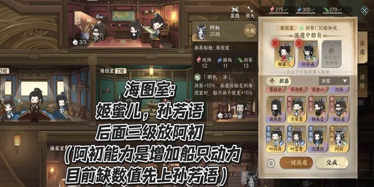 2、海圖室適合金級(jí)姬蜜兒,紫級(jí)孫芳語,后續(xù)開放阿初,阿初20級(jí)技能可加船只動(dòng)力15%,目前開兩格子先上孫芳語,后續(xù)換阿初,注重船員技能搭配。