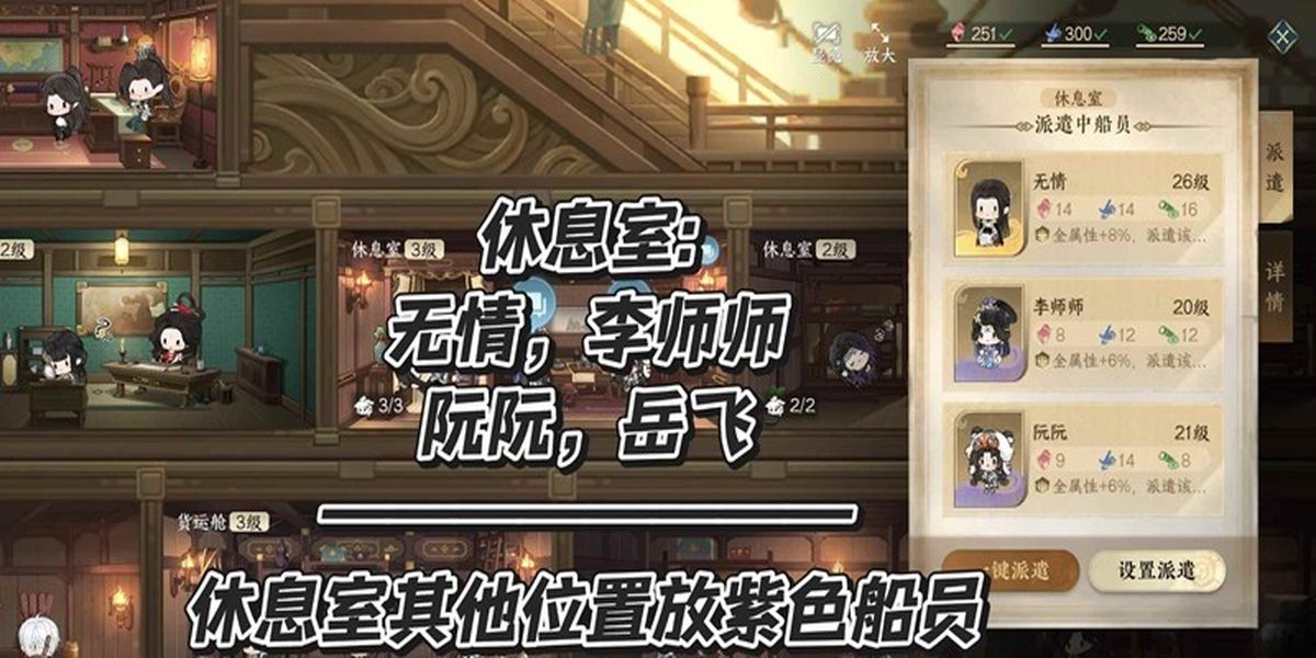4、休息室有三個(gè)位置隨機(jī)放,適合金級(jí)無情,紫級(jí)李師師、岳飛、阮阮,剩下格子放沒崗位的紫色船員或升級(jí)過的紅色船員,貨運(yùn)艙目前推薦阿初,其他放能力高的船員。