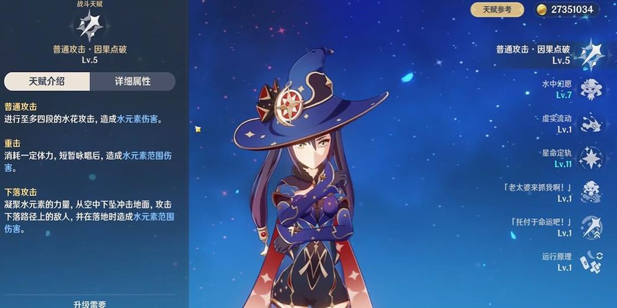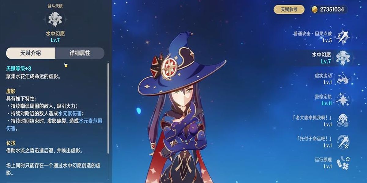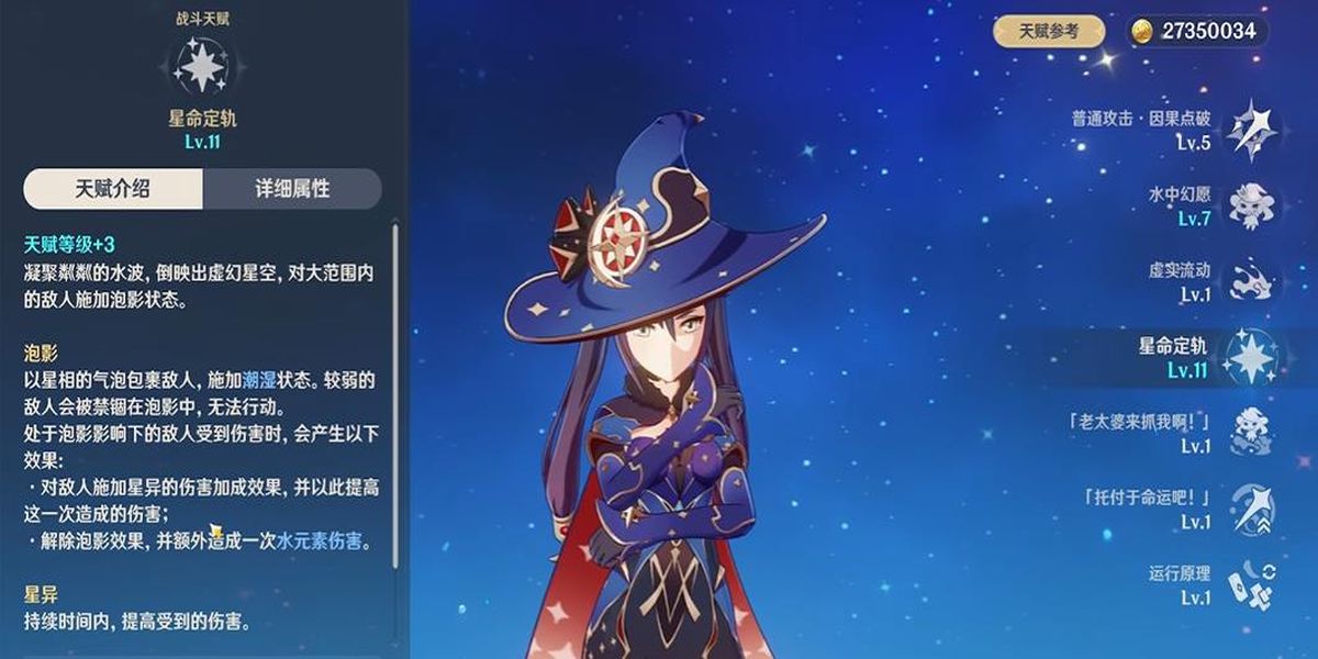 3、元素爆發(fā)為星命定軌,創(chuàng)造映照夜空的幻境,對范圍內敵人造成大量水元素傷害,幻境持續(xù)期間降低敵人水元素抗性和物理抗性,同時使范圍內的敵人受到的傷害增加。