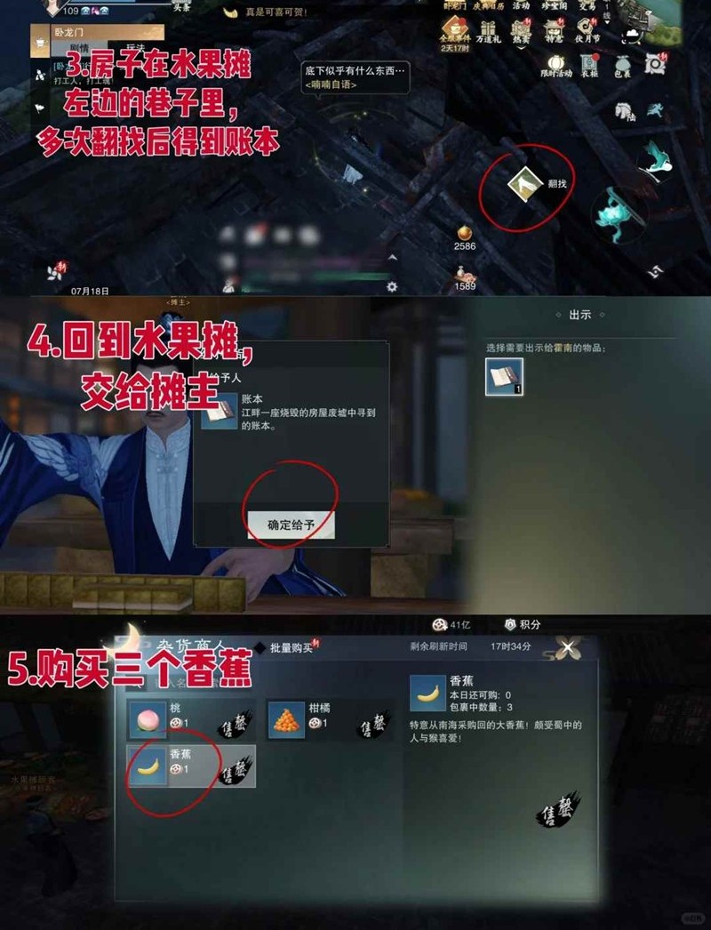 2、將找到的賬本交給攤主,解鎖水果攤購買權(quán)限,此時可購買三個香蕉,香蕉是后續(xù)任務(wù)的重要物品,需確保數(shù)量足夠。