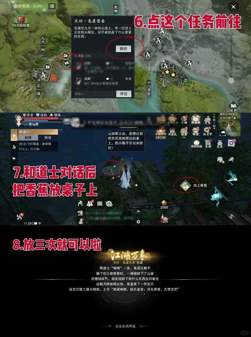 3、點擊地圖上的危崖悲客任務(wù)前往指定地點,與道士對話準備進行下一步操作,將香蕉放在道士背后的石桌上,然后走遠等待猴子過來,重復放置三次香蕉,完成獲得寶絡(luò)掛件。
