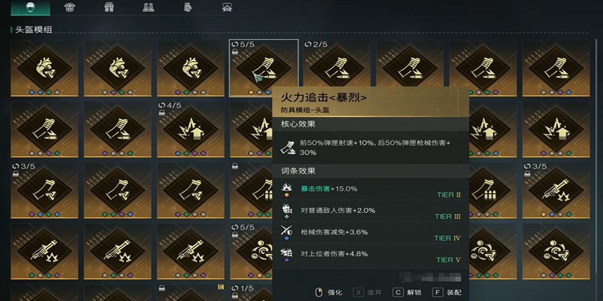 1、火力追擊是頭盔部位的模組,以彈夾容量50%為分界點(diǎn),前半段提升射速,后半段增加傷害,適合需要快速射擊的流派,在PVE戰(zhàn)斗中表現(xiàn)尤為突出。