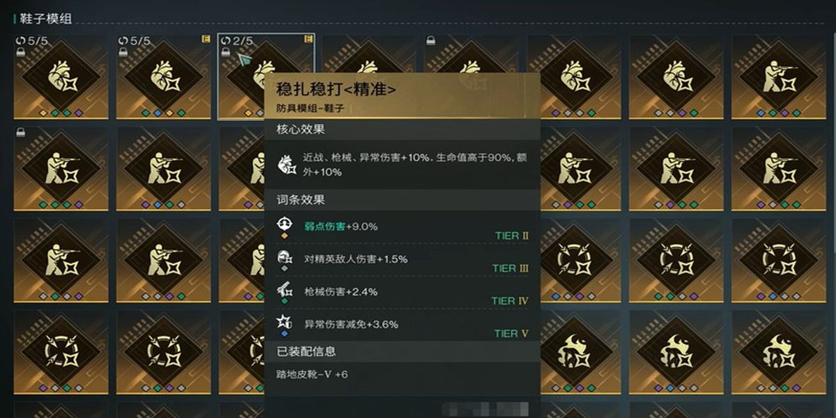2、穩(wěn)扎穩(wěn)打是鞋子部位通用性強(qiáng)的模組,基礎(chǔ)提供10%三傷加成,生命值保持在90%以上時(shí)額外獲得10%三傷提升,是穩(wěn)定增傷的優(yōu)質(zhì)選擇。