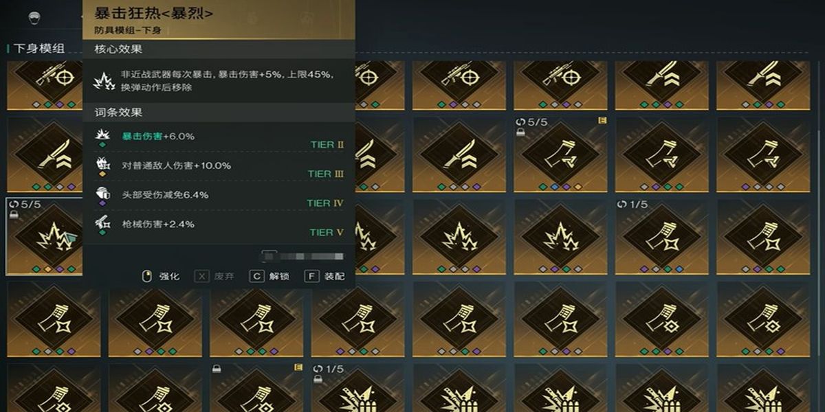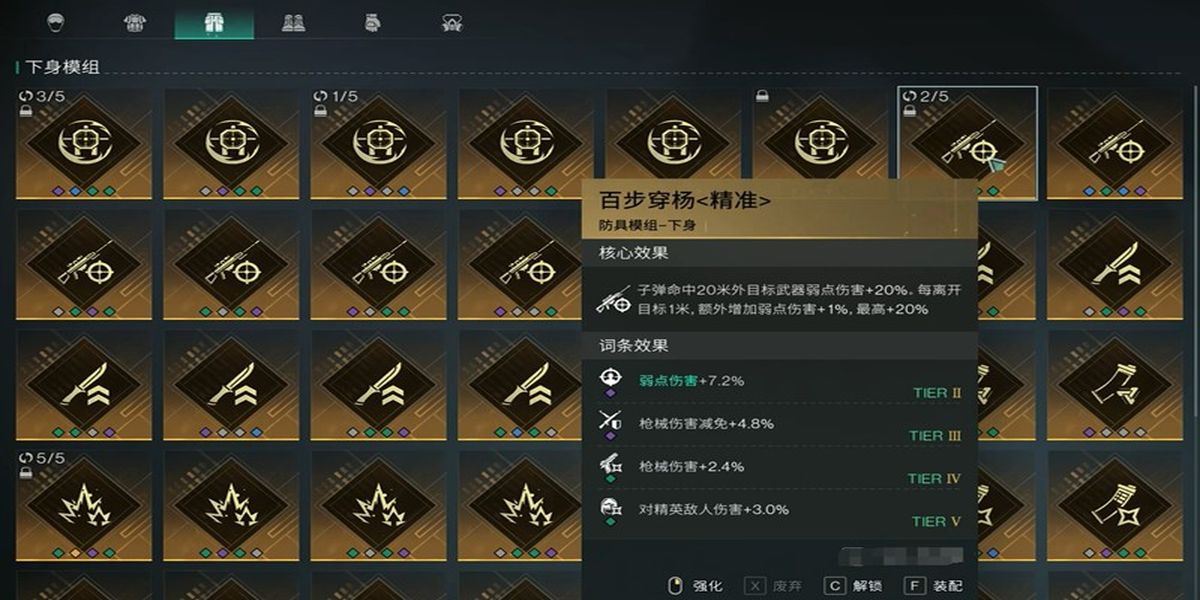 5、百步穿楊觸發(fā)條件較苛刻,需命中弱點(diǎn)且保持一定距離,但傷害提升幅度極大,是狙擊槍使用者的首選模組之一。