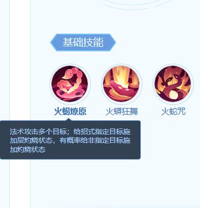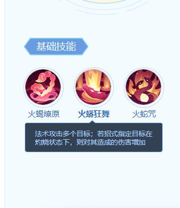 1、基礎技能中火蝎燎原可法術(shù)攻擊多個目標,能給招式指定目標施加灼燒狀態(tài),還有概率給非指定目標也施加灼燒狀態(tài),既能打出群體傷害,又有機會附加持續(xù)掉血的灼燒效果。