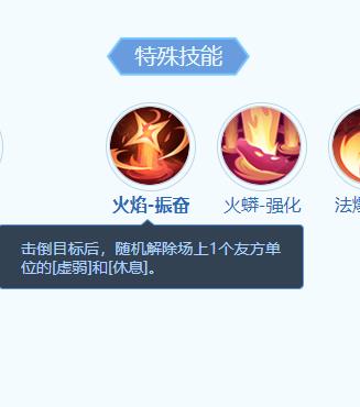 4、特殊技能里火焰振奮在擊倒目標后,隨機解除場上1個友方單位的虛弱和休息狀態(tài),在戰(zhàn)斗中可以及時恢復友方狀態(tài),保證團隊的持續(xù)作戰(zhàn)能力。