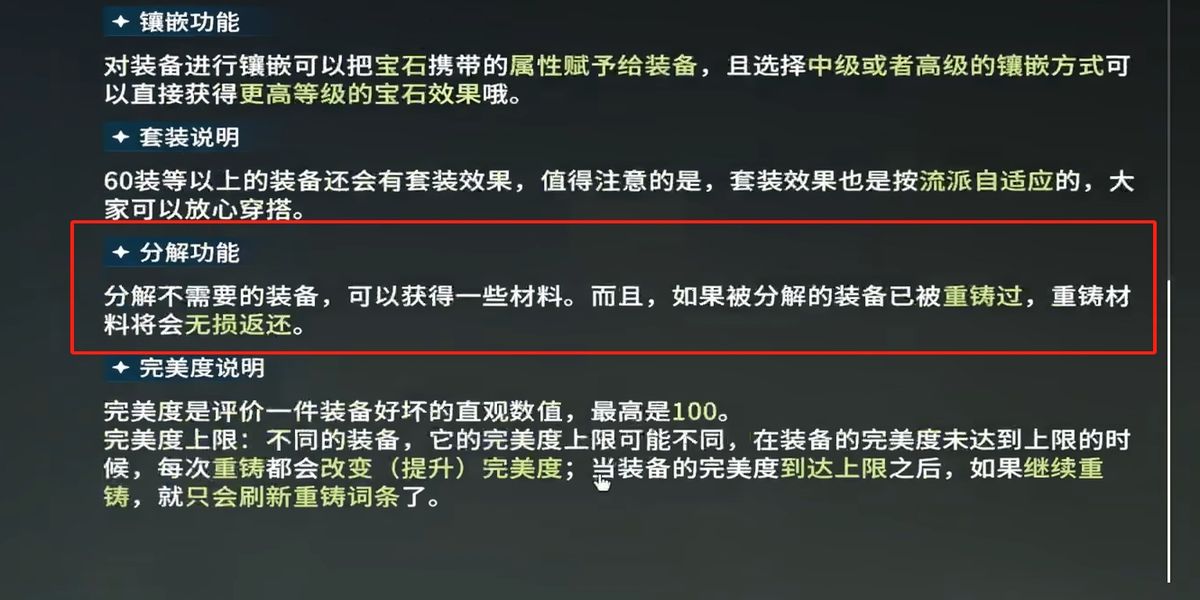 3、分解后裝備無(wú)法恢復(fù),需查看屬性確保不分解需要的,已穿戴裝備不會(huì)出現(xiàn)在備選欄,有保護(hù)機(jī)制,重鑄過(guò)的裝備分解會(huì)返還重鑄資源,減少消耗。