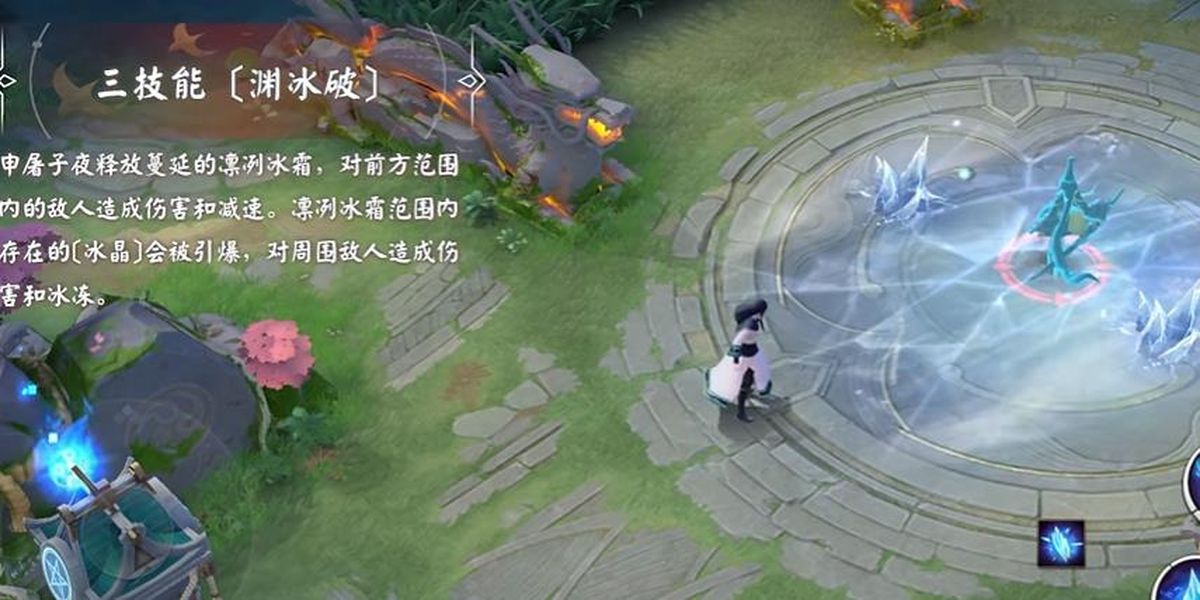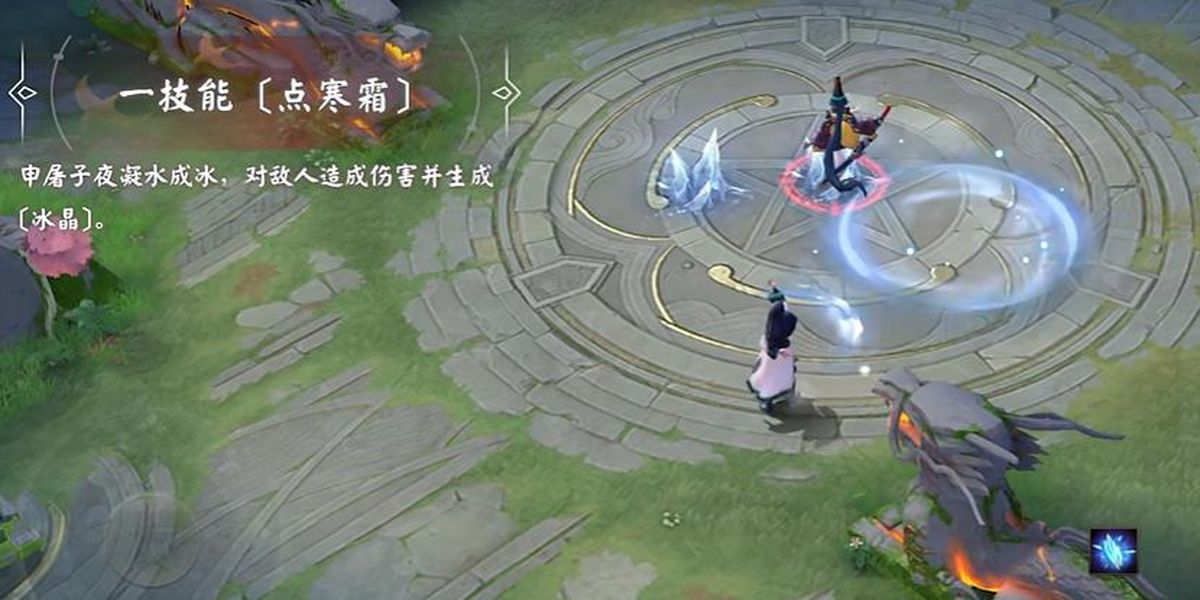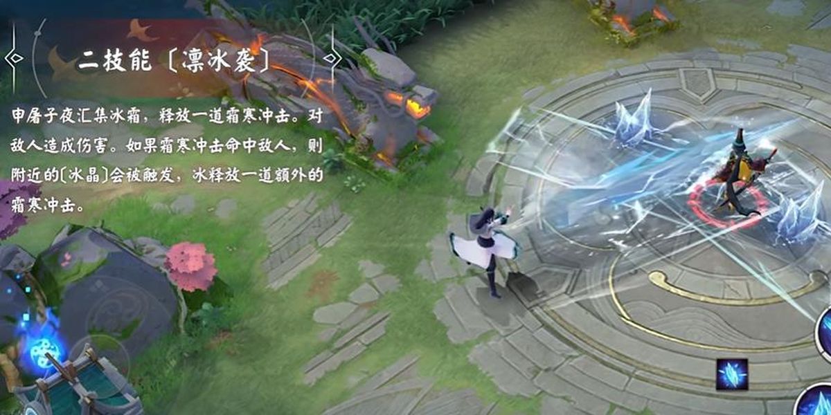 2、一技能點(diǎn)寒霜凝水成冰,短暫延遲后對圓形范圍內(nèi)敵人造成傷害,同時(shí)在中心生成冰晶,該技能可用于范圍傷害與制造冰晶,為后續(xù)控制和輸出做準(zhǔn)備。