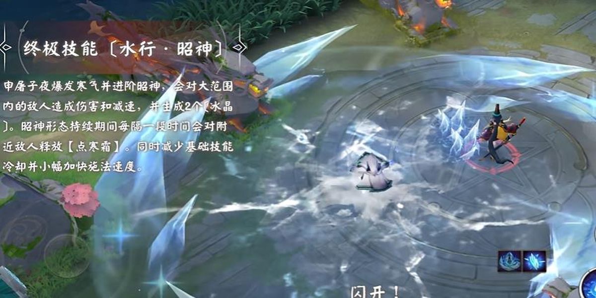 5、終極技能水行昭神爆發(fā)寒氣進(jìn)階昭神,對大范圍內(nèi)敵人造成傷害和減速,生成2個(gè)冰晶,昭神形態(tài)持續(xù)期間會自動釋放點(diǎn)寒霜,還能減少基礎(chǔ)技能冷卻并加快施法速度。