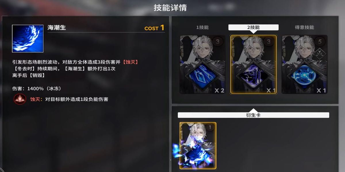 4、三技能潮海生引發(fā)形態(tài)場(chǎng)劇烈波動(dòng),對(duì)敵方全體造成3段傷害并附加蝕滅,冬去時(shí)持續(xù)期間,該技能額外打出離手后直接銷(xiāo)毀。