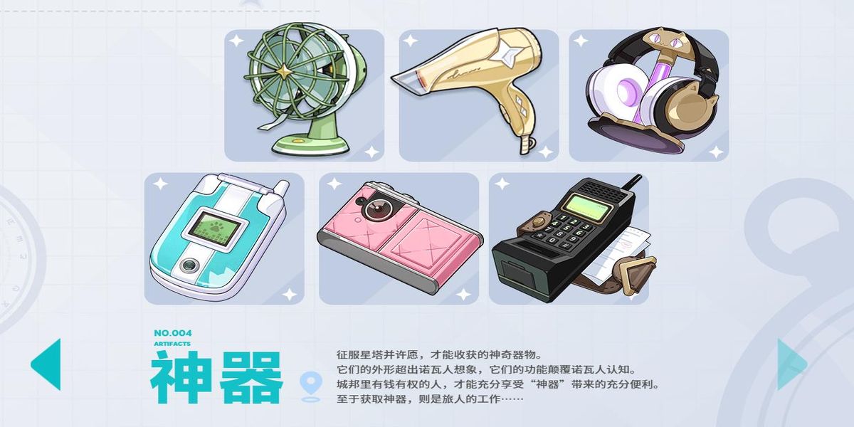 4、神器是征服星塔并許愿才能收獲的神奇器物,外形超出諾瓦人想象,功能顛覆諾瓦人認(rèn)知,城邦里有錢有權(quán)的人能享受其便利,獲取神器則是旅人的工作,在世界中有著特殊作用。