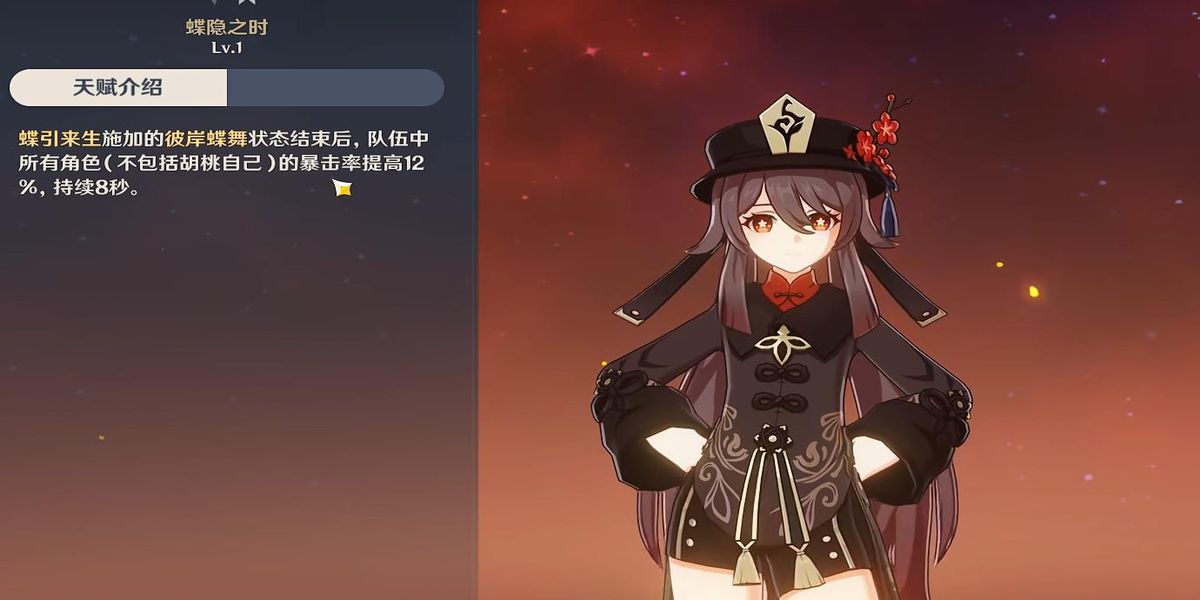 4、蝶隱之時,胡桃受傷害后有一定概率在接下來10秒內(nèi),使隊伍中所有角色不包括胡桃自己火元素傷害提高,為團(tuán)隊火元素輸出提供增益。