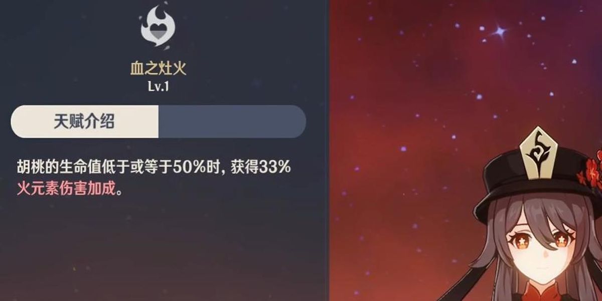 6、多多益善,隊伍中所有角色不包括胡桃自己在生命值上限低于50%時暴擊率提升,讓胡桃在隊伍搭配時可與一些低血量爆發(fā)角色形成配合。