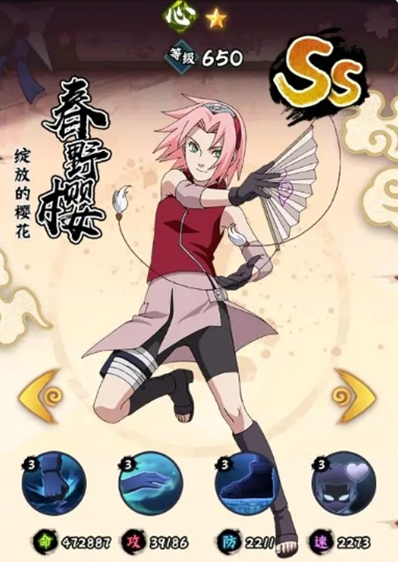 1、采用SSS加SS搭配模式,推薦綱手雷影我愛羅波佐助和大蛇丸組合,綱手輔助治療,雷影主力輸出,我愛羅強力防御,佐助和大蛇丸群體輸出,有穩(wěn)定前排和強力后排輸出。