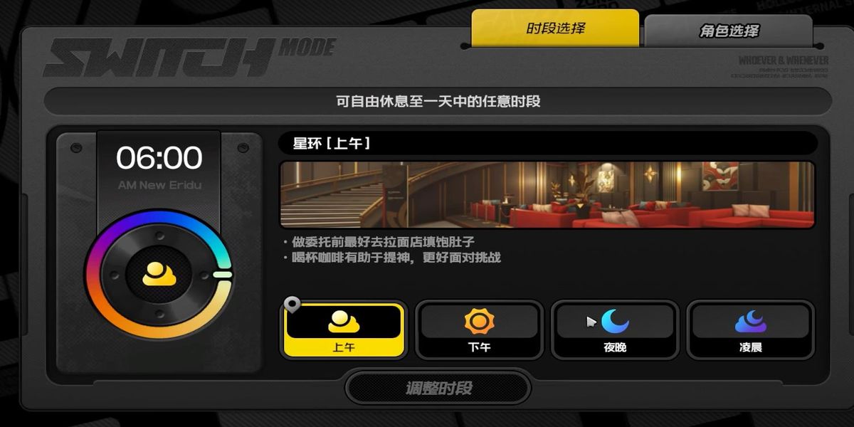 2、到達流光大廳后,需將游戲內時間調整至工作時段,09點到18點,可通過游戲內時間設置功能完成調整,該時段才會出現觸發(fā)成就的必要角色互動。