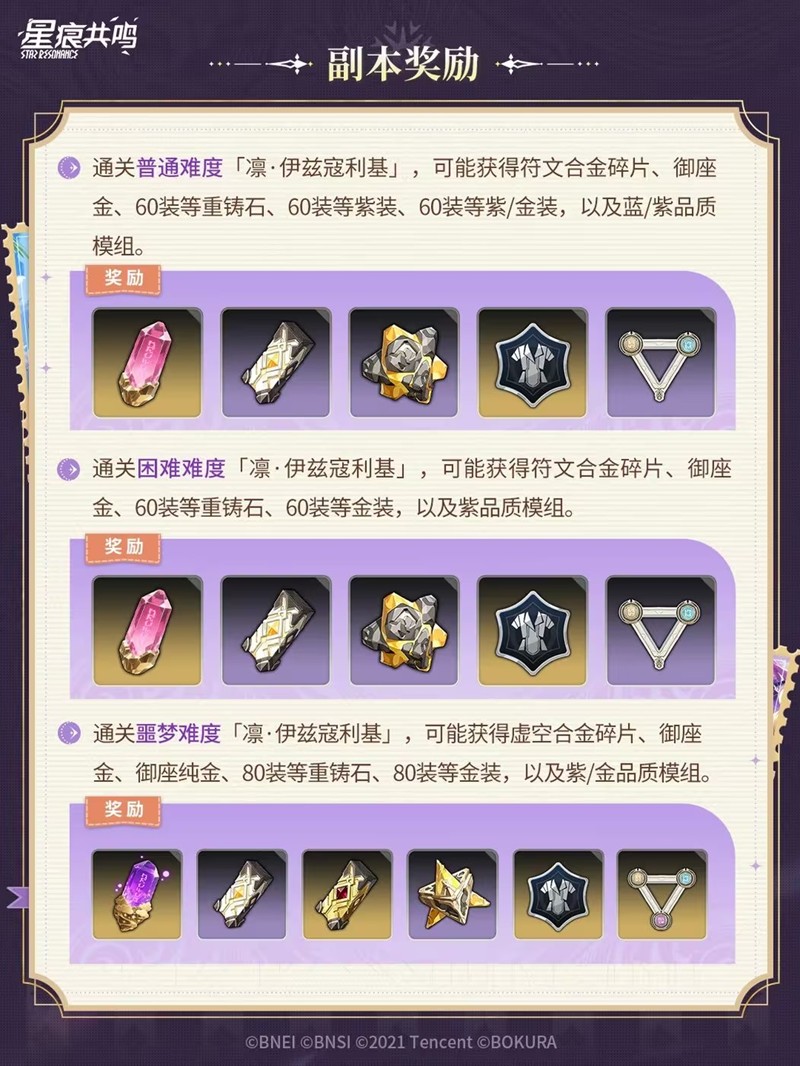3、通關(guān)凜伊茲寇利基可獲符文合金碎片、御座金、60裝等重鑄石、60裝等紫裝及紫金裝、藍紫品質(zhì)模組,困難獎勵升級60裝等金裝和紫品質(zhì)模組,噩夢有虛空合金碎片等更豐厚獎勵。
