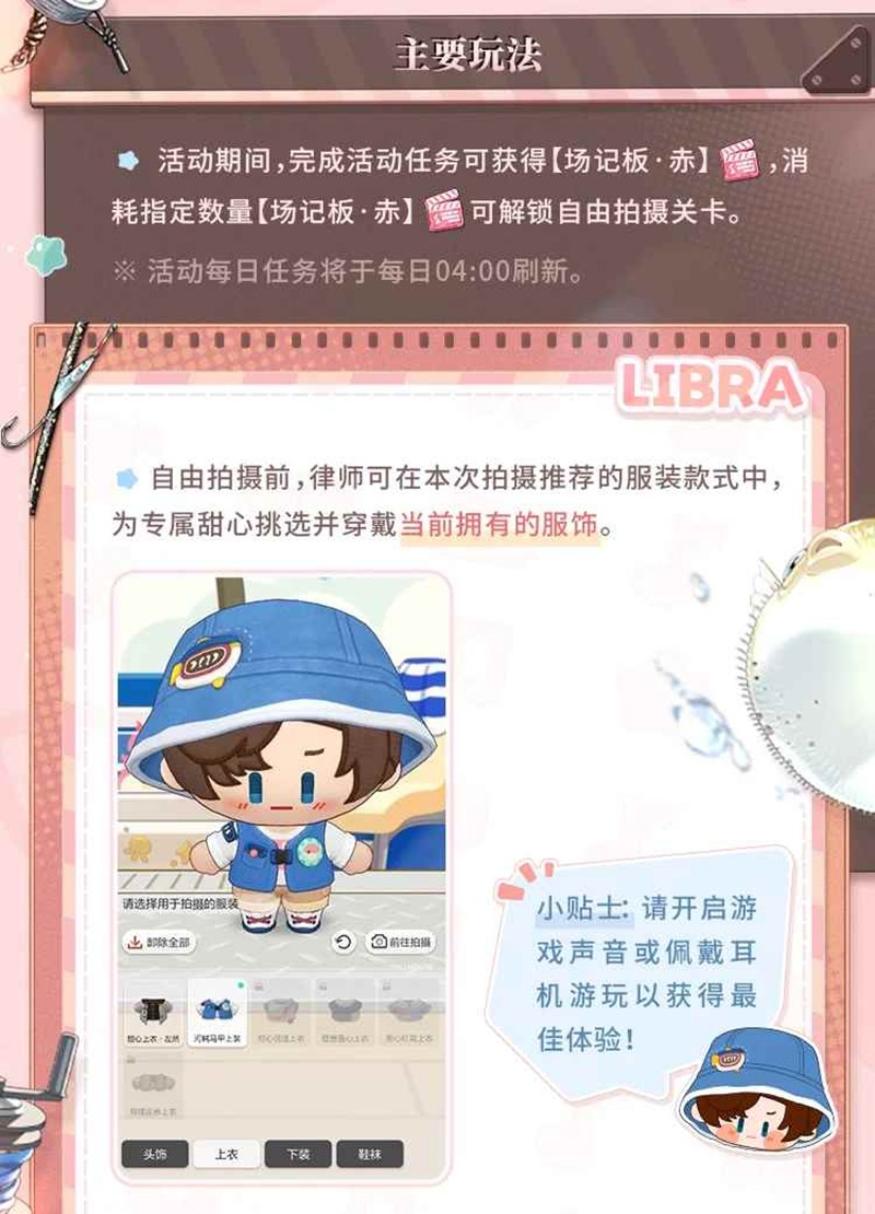 2、制作漁趣滿滿組合家裝消耗的蜜意甜心值減半,完成活動(dòng)任務(wù)可獲得場(chǎng)記板赤,消耗指定數(shù)量場(chǎng)記板赤可解鎖自由拍攝關(guān)卡,每日任務(wù)會(huì)在固定時(shí)間刷新。