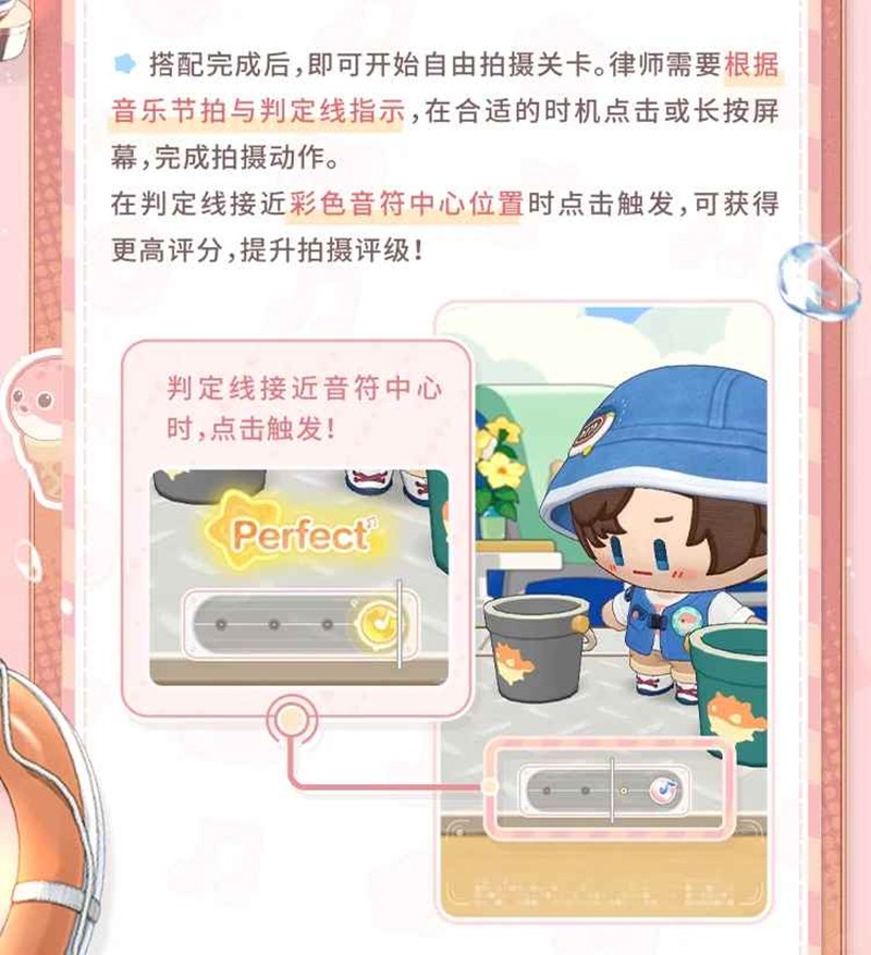 3、自由拍攝前玩家可在推薦服裝款式中為專屬甜心挑選并穿戴已有服飾,拍攝時(shí)需根據(jù)音樂(lè)節(jié)拍與判定線指示點(diǎn)擊或長(zhǎng)按屏幕,在合適時(shí)機(jī)操作可獲更高評(píng)分。