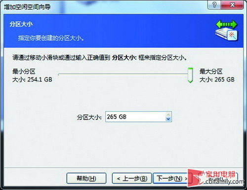 拉動滑塊即可增加容量,這一步是調(diào)節(jié)分區(qū)大小,左側(cè)的數(shù)據(jù)就是所調(diào)節(jié)分區(qū)目前的容量,右側(cè)的數(shù)據(jù)則表示這個分區(qū)最大可以調(diào)節(jié)到多大。當(dāng)然這個最大值和其他分區(qū)空閑的容量是相關(guān)的。我們可以拉動上面的滑塊,也可以直接在下面填入數(shù)字調(diào)節(jié)容量大小。