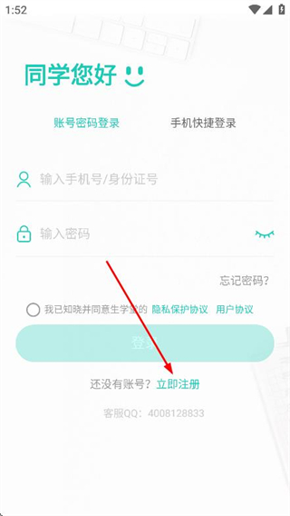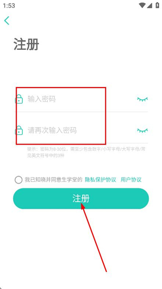 1、打開生學(xué)堂app,在登錄頁面,點(diǎn)擊立即注冊選項(xiàng)。