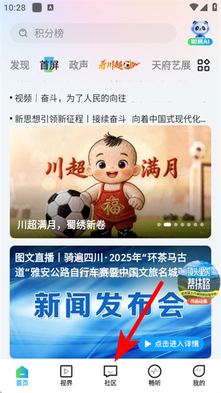 1、打開四川觀察app,點擊底部社區(qū)的選項,進入社區(qū)的頁面。