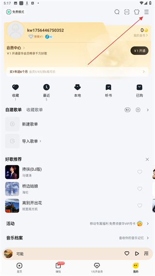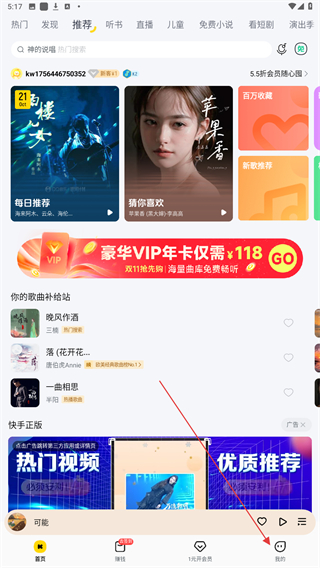 1、啟動酷我音樂APP,進(jìn)入首頁點(diǎn)擊右下我的按鈕。
