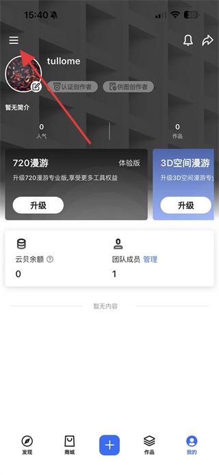 2、在作品管理頁面,點擊底部+,進入創(chuàng)建720漫游的選項頁面。