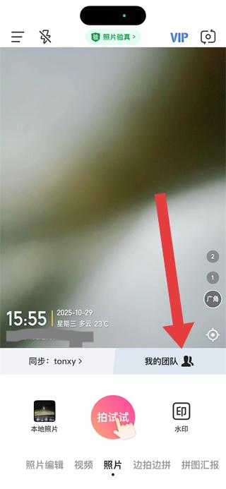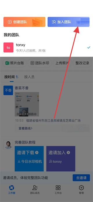 1、打開(kāi)今日水印相機(jī)應(yīng)用,點(diǎn)擊頁(yè)面中的我的團(tuán)隊(duì)選項(xiàng)。