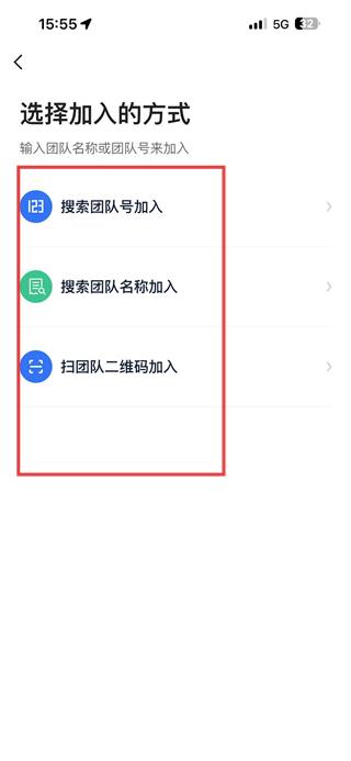 3、進(jìn)入選擇加入方式頁(yè)面后,可選擇搜索團(tuán)隊(duì)號(hào)、搜索團(tuán)隊(duì)名稱(chēng)或掃團(tuán)隊(duì)二維碼加入。
