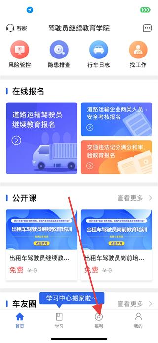1、打開駕駛員繼續(xù)教育,點擊導(dǎo)航欄的福利選項。