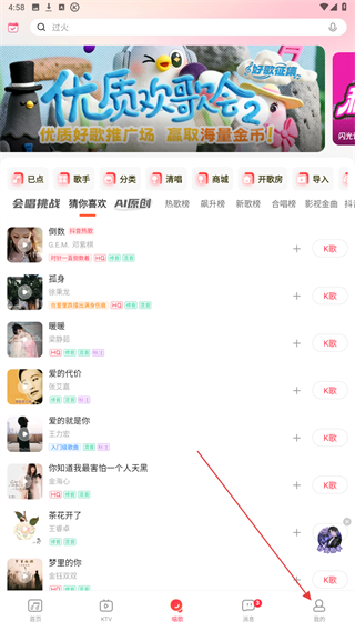 1、打開(kāi)唱吧k歌APP,在首頁(yè)右下角點(diǎn)擊我的圖標(biāo)。