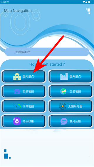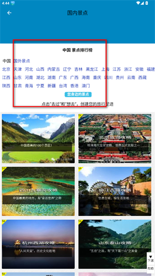 1、打開地圖導(dǎo)航類軟件,點(diǎn)擊國內(nèi)景點(diǎn),進(jìn)入國內(nèi)景點(diǎn)頁面。
