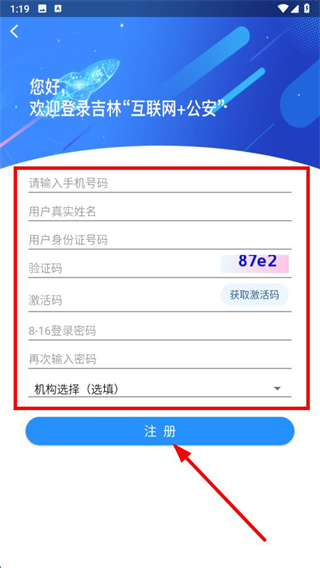 3、在注冊頁面中,依次在輸入框內(nèi)輸入信息,選填機構(gòu)后點擊注冊。