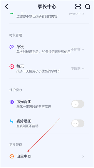 1、啟動(dòng)優(yōu)酷少兒的應(yīng)用,在家長(zhǎng)中心的界面內(nèi)找到并點(diǎn)擊設(shè)置中心的按鈕。