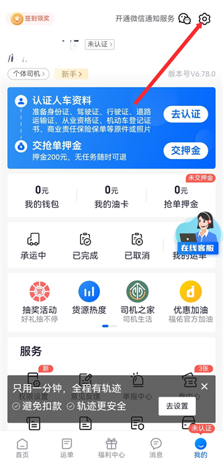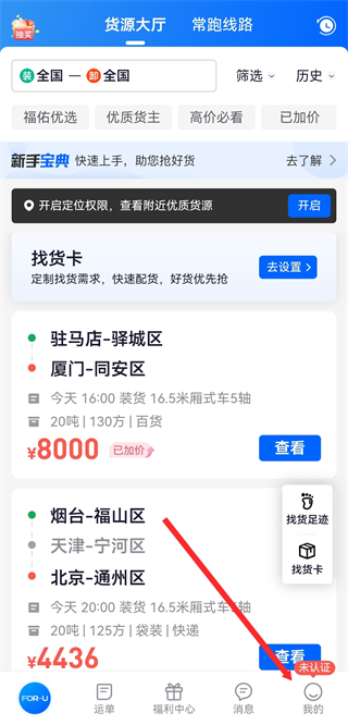 1、打開福佑卡車司機(jī)APP,點(diǎn)擊右下角我的,進(jìn)入個人頁面。