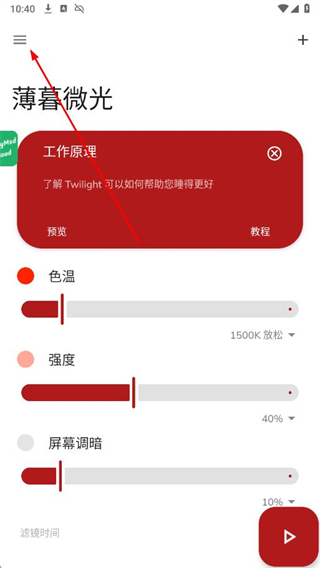 薄暮微光(Twilight)應(yīng)用使您的設(shè)備屏幕適應(yīng)一天中的時(shí)間推移。它會(huì)在日落后過濾掉您手機(jī)或平板電腦屏幕上的藍(lán)色光譜,并以柔和而悅目的紅色濾鏡來保護(hù)您的眼睛。濾鏡的強(qiáng)度會(huì)根據(jù)您所在地日出與日落時(shí)間的日照周期而平滑地調(diào)節(jié)。